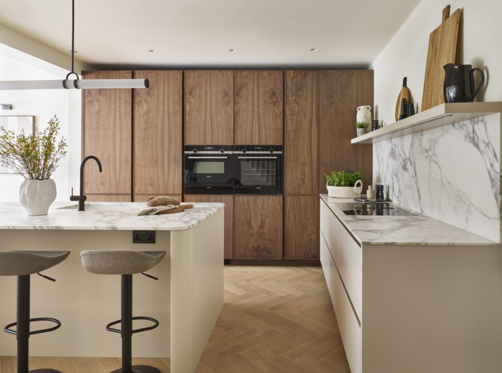 Bo kuchnia przestała być odizolowanym pomieszczeniem do gotowania. W większości mieszkań to już część salonu, przestrzeń, w której spędzamy czas nie tylko przy garnkach. I tutaj wchodzi tzw. “ciepły minimalizm” – trend, który dominuje w tym roku. Beże, kaszmir, taupe, naturalne drewno i kamień. Technologia jest, owszem, ale ukryta – lodówka wtopiona we front, indukcja bez wystających pokręteł, piekarnik schowany za gładką płytą laminatu.
